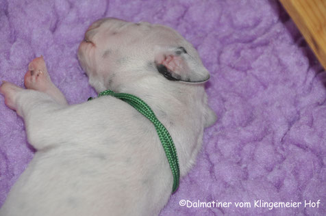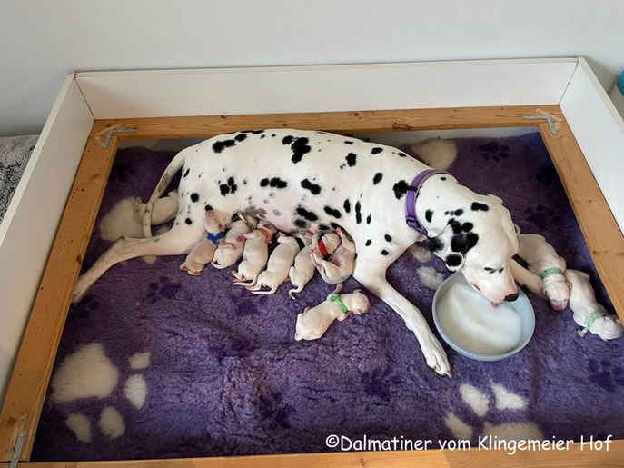 An dieser Stelle müssen wir aber doch mal unsere Mira loben: Sie hat ihren ersten Wurf und weiß dennoch ganz instinktiv, was sie tun muss. Unermüdlich pflegt und ernährt sie die kleinen Nullpünktchen rund um die Uhr. Dabei bekommt sie von mir natürlich alle Unterstützung, die möglich ist. Da die Welpen auch nachts ständig gesäugt werden, muss Mira natürlich auch nachts mit frischen Wasser, Ziegenmilch und Futter versorgt werden. Auch die homöopathischen Mittel, die sie zur Rückbildung, Milchbildung, usw. bekommt, müssen regelmäßig verabreicht werden. Da die Welpen recht unterschiedliche Geburtsgewichte haben, müssen die Kleinen auch schon mal protegiert werden, d.h. ein sehr dicker Welpe saugt eine Zitze an, ein Kleiner wird dort angelegt und trinkt sich satt, dann darf der "Dicke" sich weiter an der köstlichen Muttermilch laben. Praktisch ist, dass ich im Wurfzimmer auf dem Schlafsofa übernachte und deshalb Mira jederzeit zur Seite stehen kann.