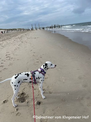 Mira genießt die gesunde Seeluft in Holland, gegen andere Trächtigkeitsgelüste muss sie leider mit der Leine gesichert sein. Zu sehr lockt der Speisezettel am Meer. Alte Krebse und Möwenflügel sind nicht unbedingt bekömmlich für eine Trächtige.