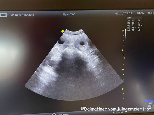 Heute, am 25. August, haben wir den Ultraschalltermin bei unserer Tierärztin. Wie immer sind wir sehr aufgeregt, denn, obwohl wir schon etwas ahnen, sehen wir unsere kleinen O-chen nun zum ersten Mal. Aber seht selbst: