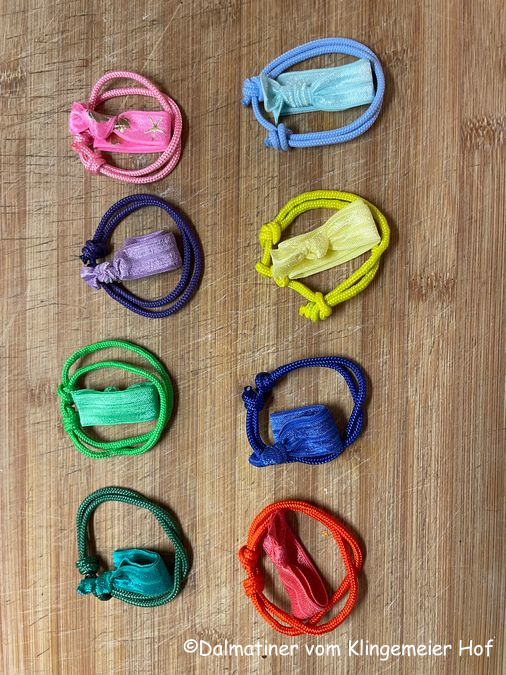 Die kleinen Halsbändchen, die unsere O-chen tragen sollen, sind fertig. Und zwar jeweils ein Arbeitsbändchen, das direkt nach der Geburt übergestreift wird und das Bändchen für die erste Woche.
